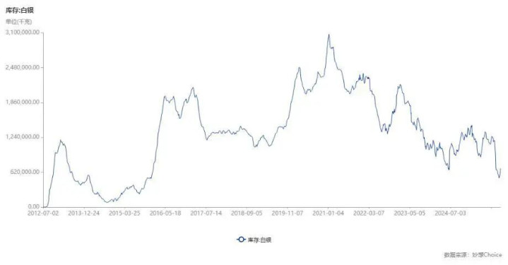 值得关注的是,据Choice金融终端提供的上期所白银库存数据,2025年12月5日,上期所白银库存量为68.8万千克,年内累计下降51.18%;相比2021年1月8日的峰值307.55万千克,累计降幅达77.63%。